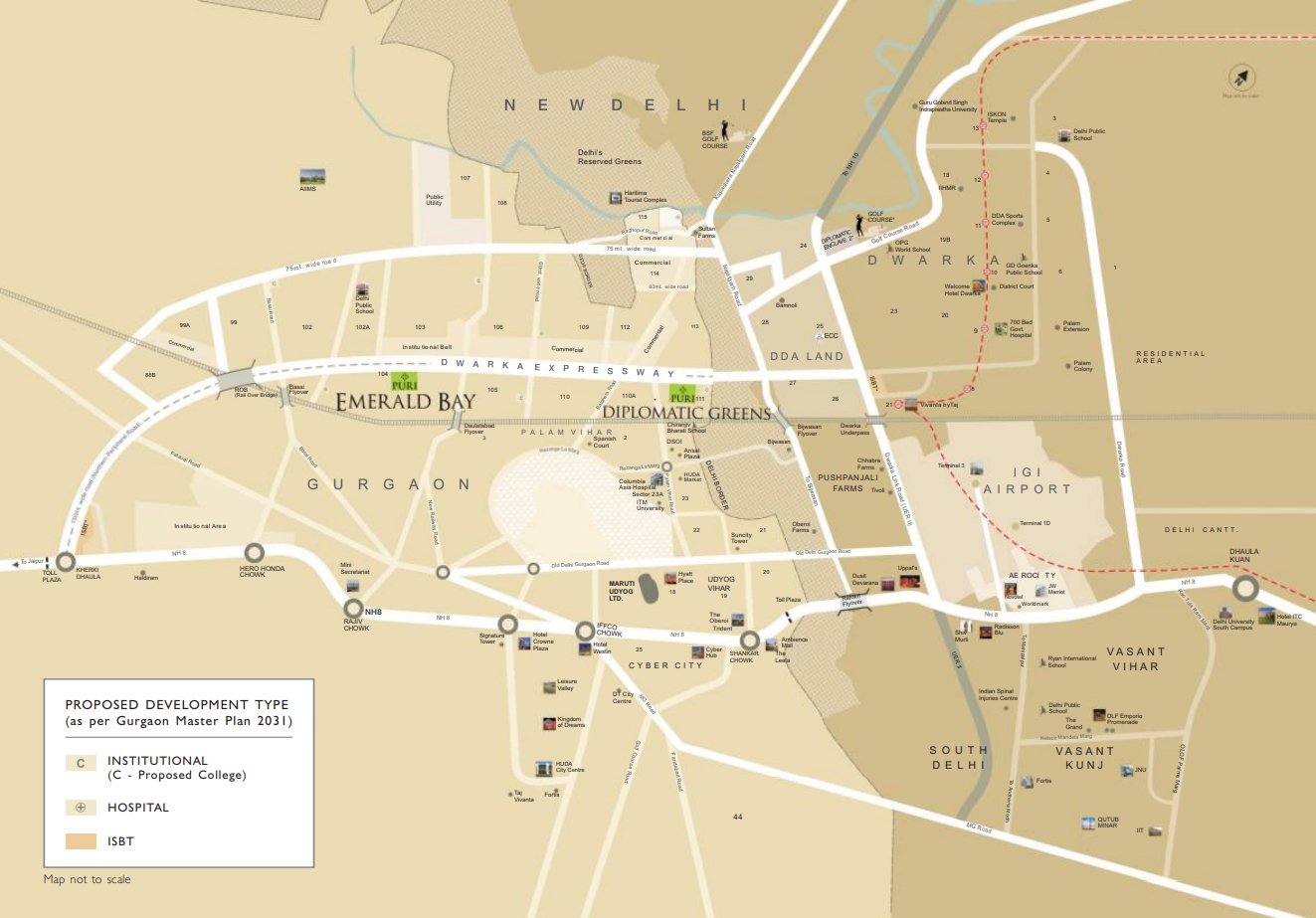 Diplomatic Greens is an iconic, imposing property on the proposed Dwarka Gurgaon Expressway. The 18 km long Northern Peripheral Road starts from Dwarka connecting the new, growth centres of Delhi, Gurgaon and PalamVihar, while joining the National Highway 8 near KherkiDhaula.